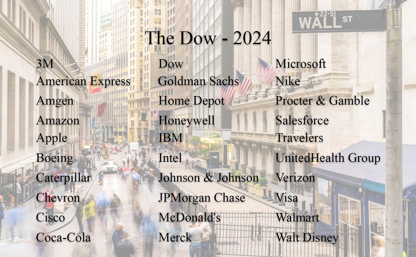 In 1928, the editors of The Wall Street Journal expanded the Dow from 12 to 30 stocks. Today, a committee reviews and makes periodic changes to the Dow in order to have the index reflect the prominent businesses of the times. The most recent change occurred in February 2024 when Amazon replaced Walgreens Boots Alliance in the index.