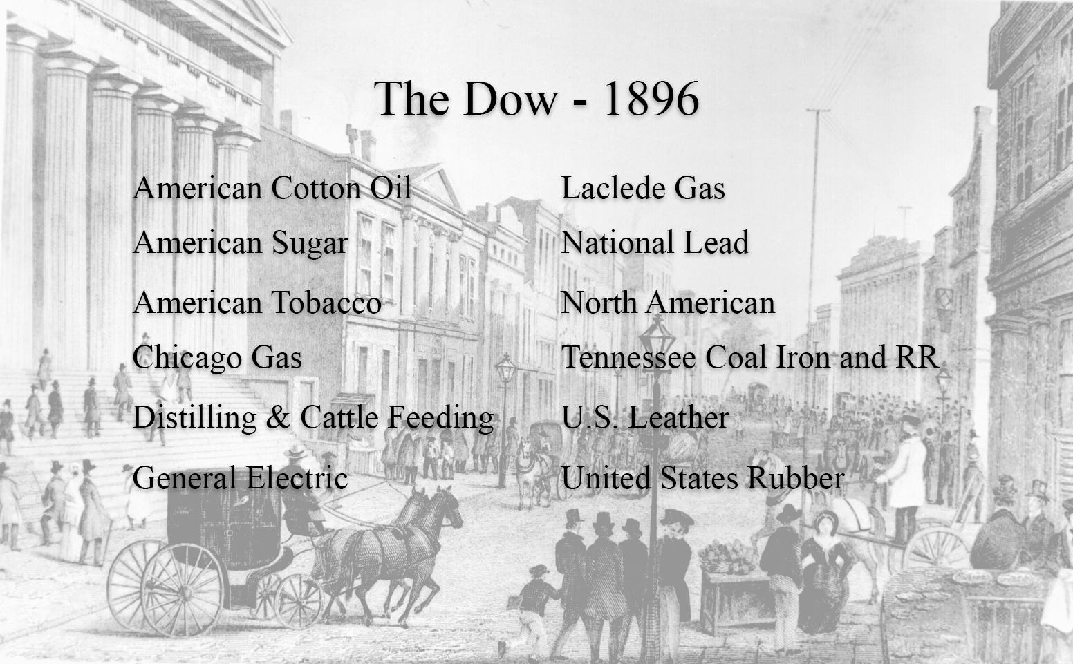 So it was that on May 26, 1896, Dow Jones & Co. published the Dow Jones Industrial Average, based on the average price of the following 12 stocks, essentially the corporate Titans of the day: