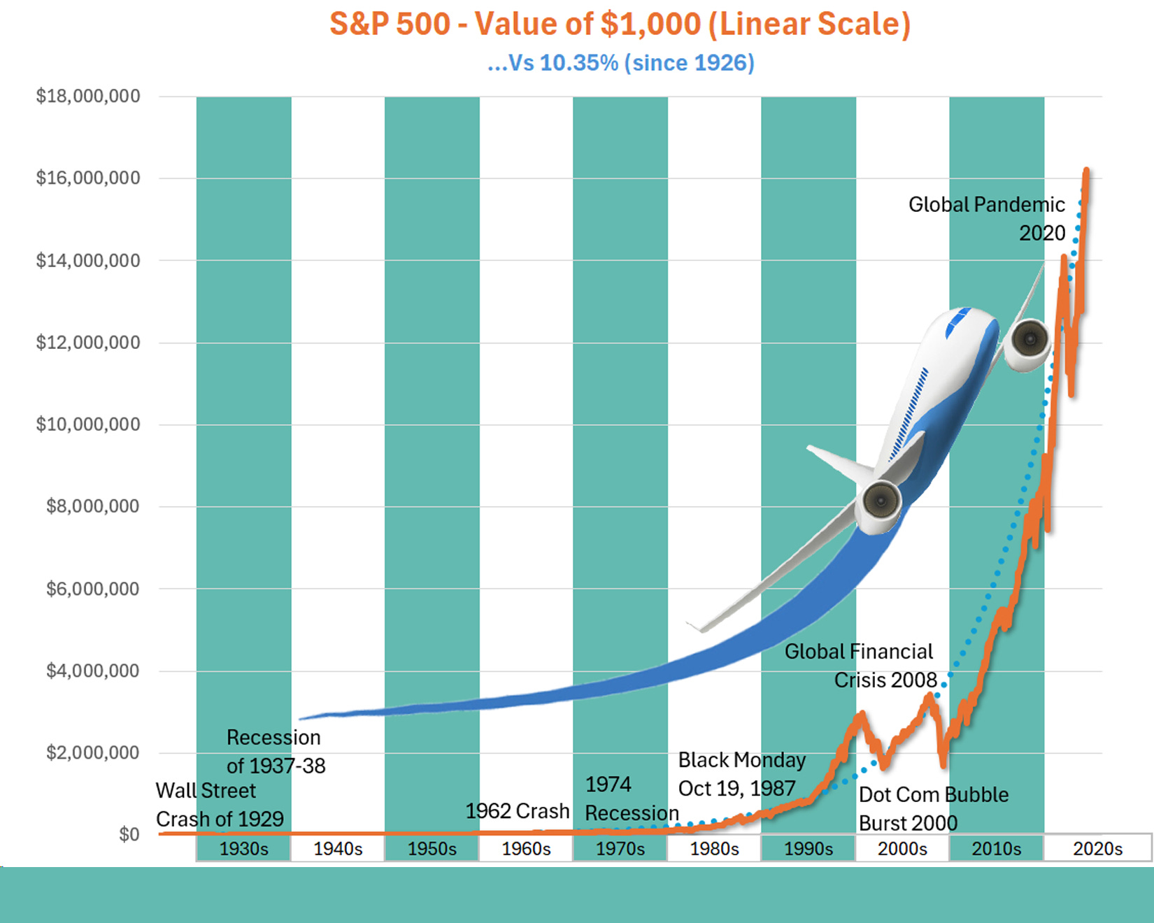 The dotted Blue Line shows growth at 10.35%, the long-term historical return on stocks.