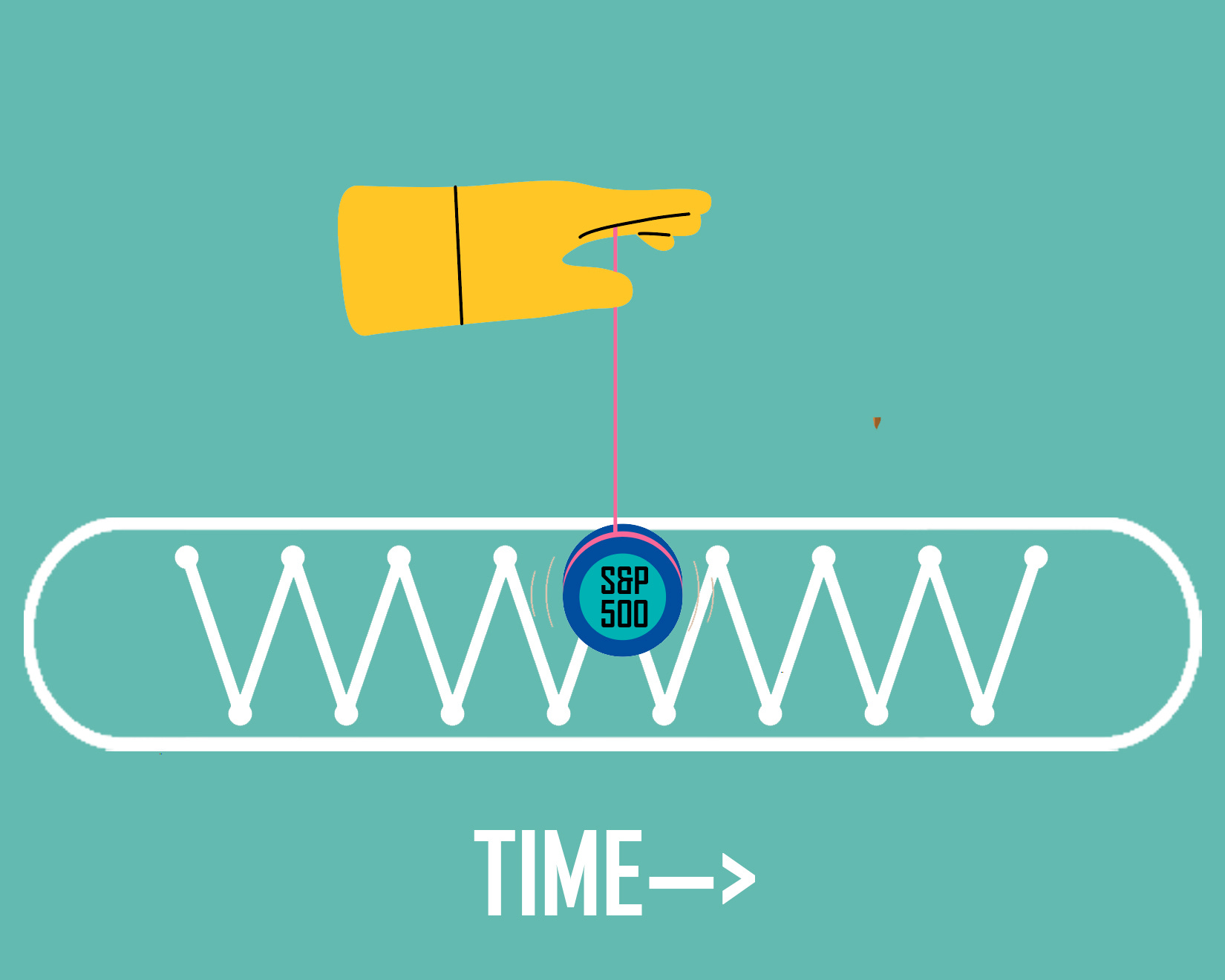 Let’s assume the ups and downs of the stock market are represented by a yo-yo going up and down and that investing in the stock market is like playing with the yo-yo while walking on a moving sidewalk (like you see in the airport).