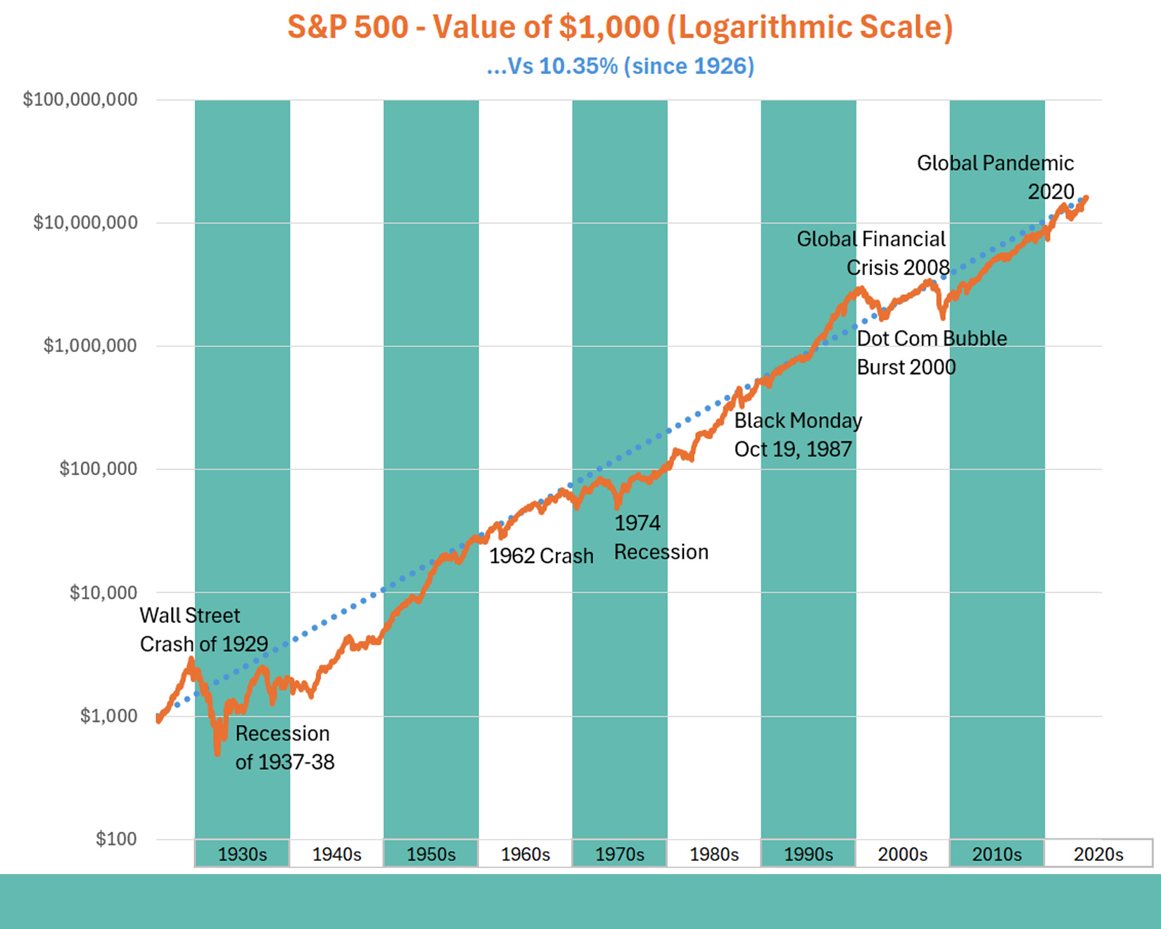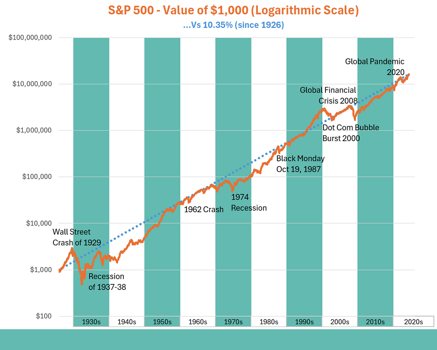 This shows the growth of $1,000 since 1926. To make it possible to see what’s going on, the scale is different than you’re used to seeing. Each horizontal line is 10 times greater than the previous value (i.e., it’s a logarithmic scale).
